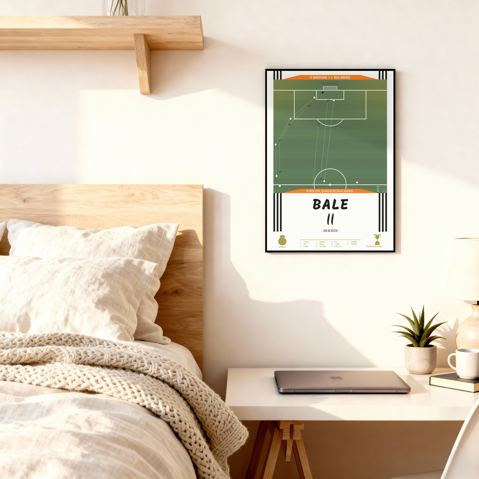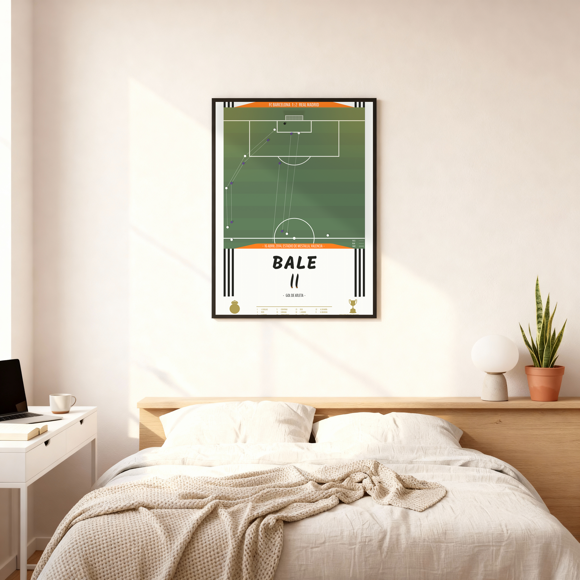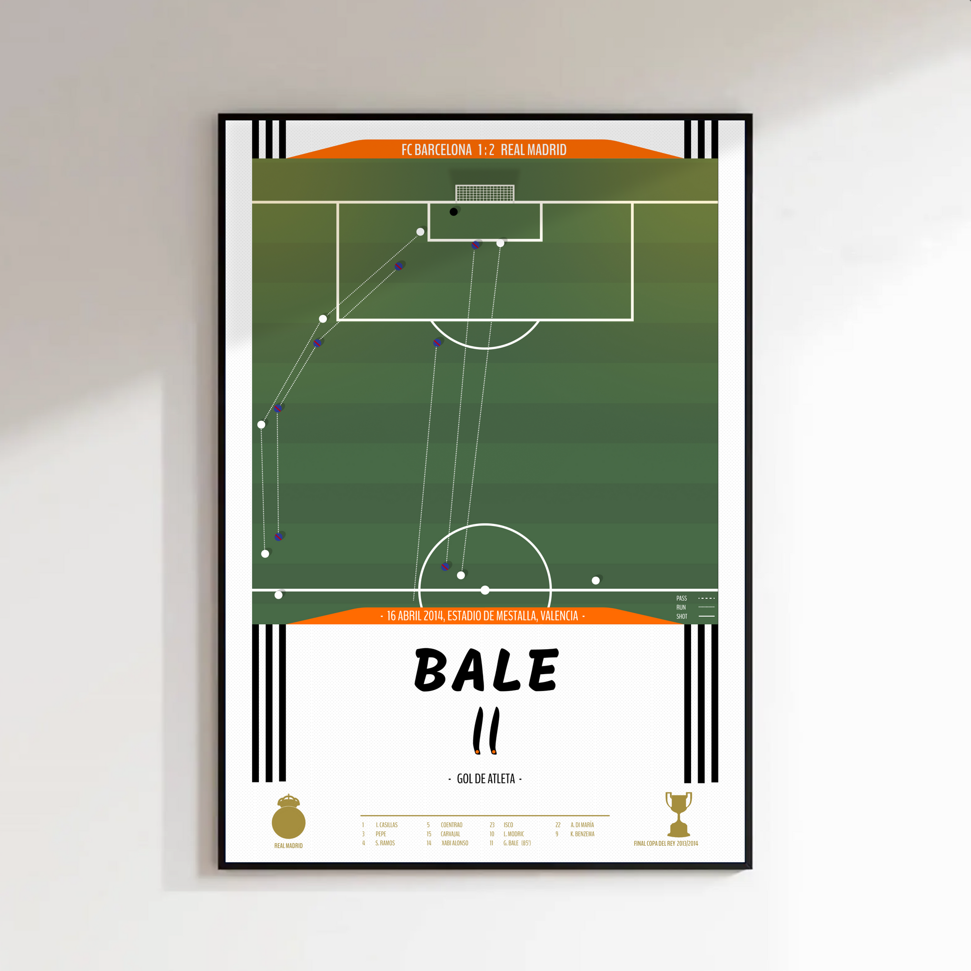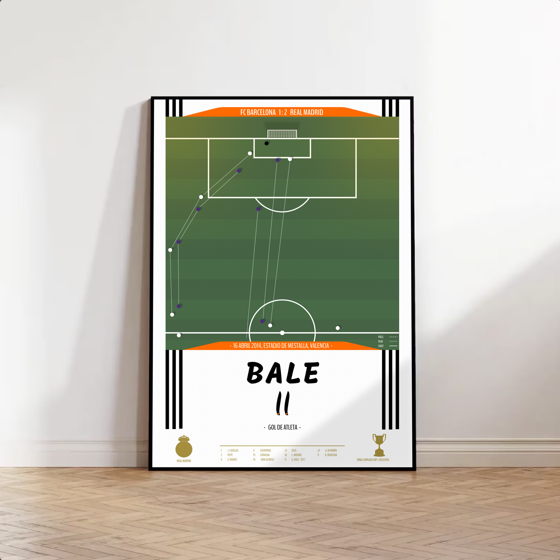 Revive la magia blanca con este póster del inolvidable gol de Gareth Bale en la final de la Copa del Rey 2014. Esta lámina ilustra la increíble carrera del galés desde el mediocampo hasta el área rival, dejando atrás a su defensor y sellando la victoria 2-1 del Real Madrid ante el Barcelona en Mestalla. Una pieza que captura la velocidad, la fuerza y la determinación de Bale en uno de los momentos más icónicos de su carrera. Perfecta para cualquier aficionado merengue o amante del fútbol, este póster dará un toque épico a tu pared o será el regalo ideal para un verdadero fan.