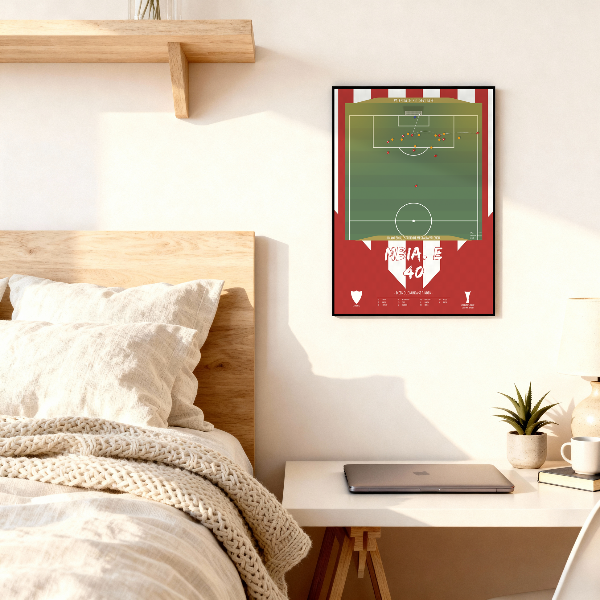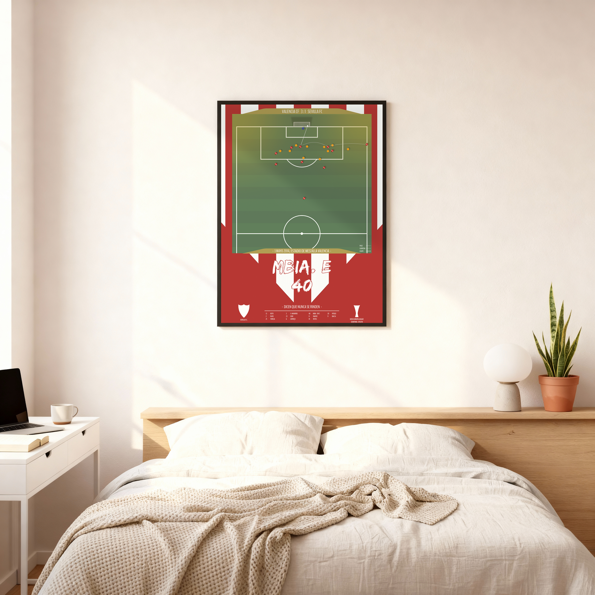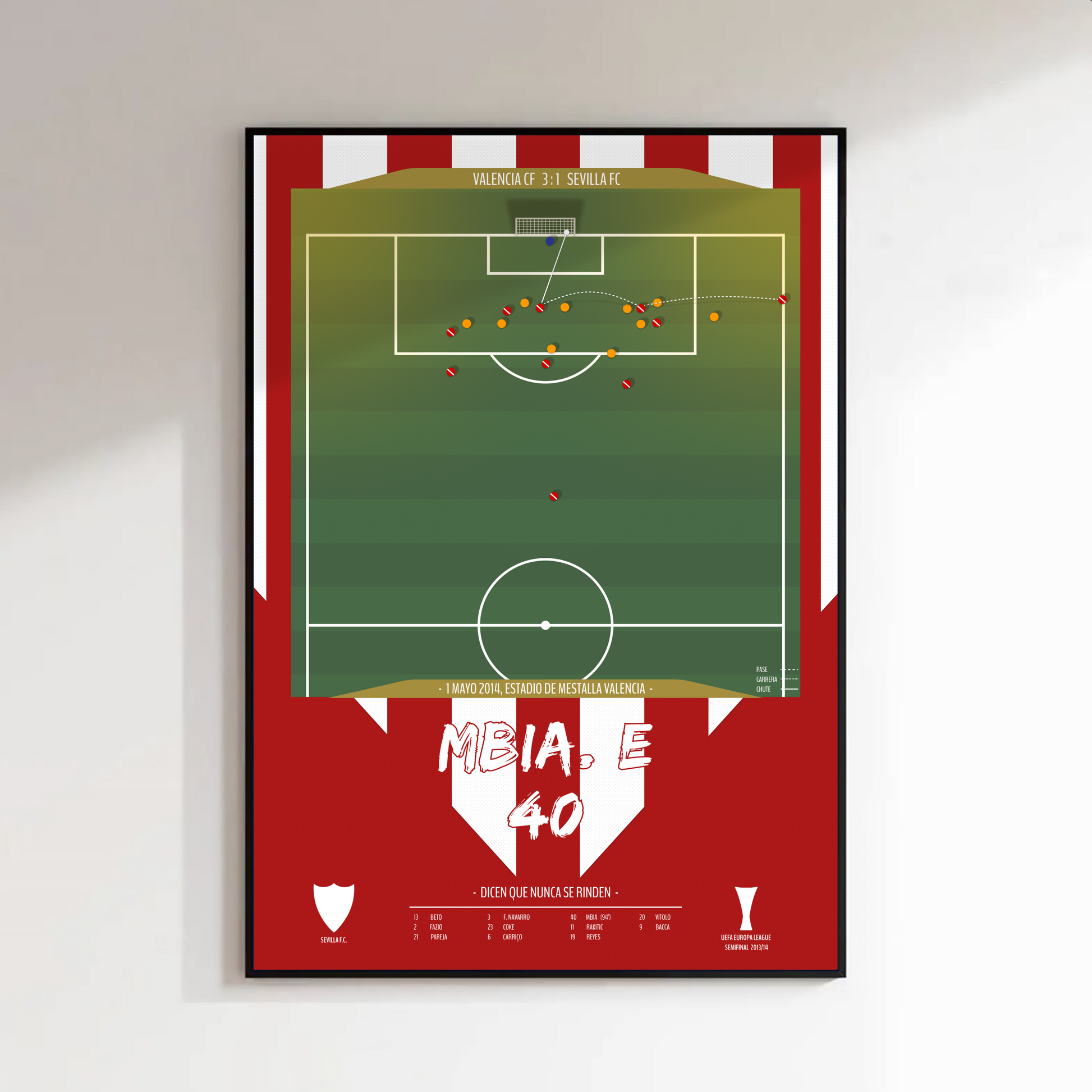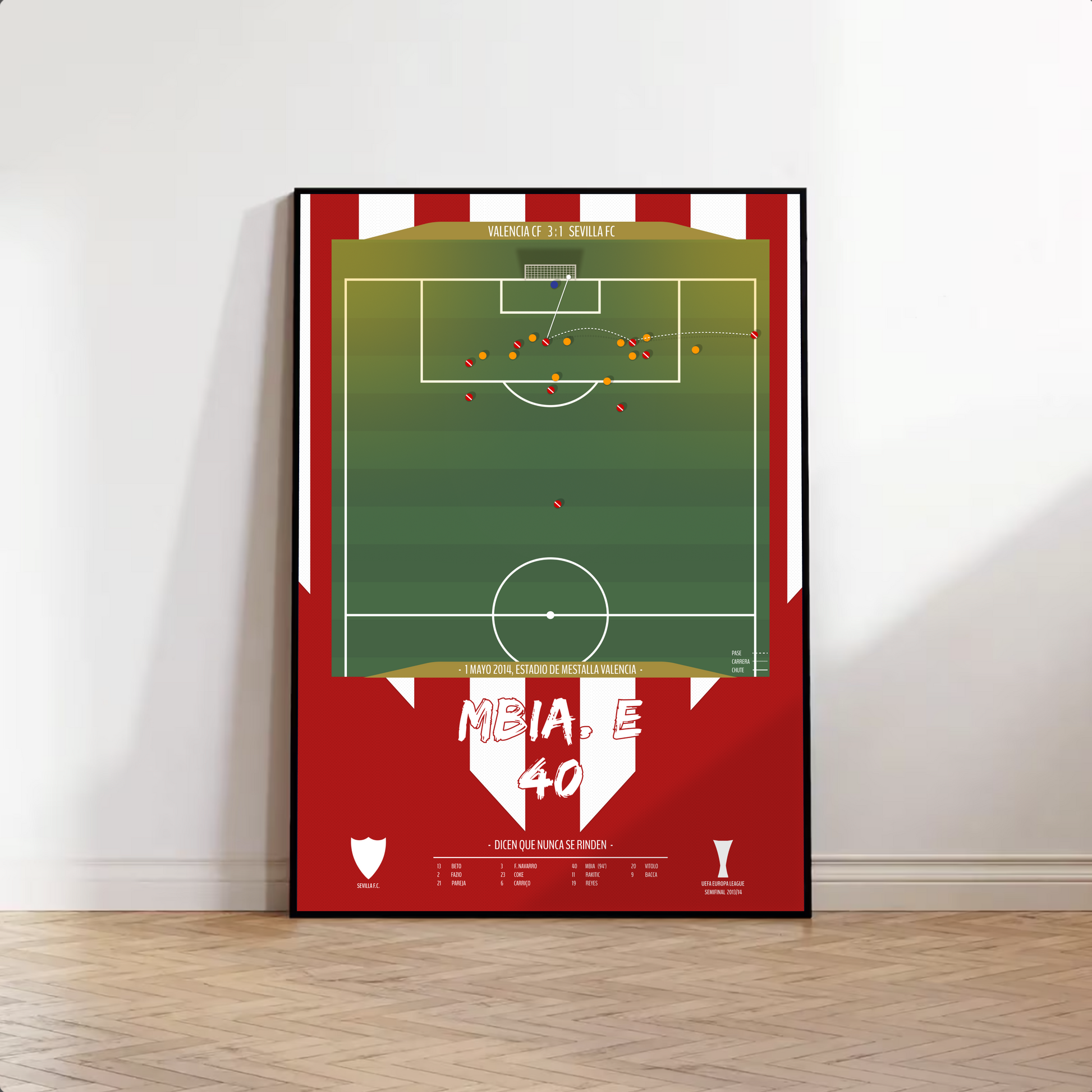 Revive una de las noches más emocionantes en la historia del Sevilla FC con este póster del inolvidable gol de Stéphane M’Bia en las semifinales de la Europa League 2014. El 1 de mayo, en Mestalla, el camerunés firmó un cabezazo milagroso en el tiempo añadido que selló la clasificación del Sevilla para la final y dio comienzo a una dinastía europea. Esta lámina captura la esencia del lema sevillista: Dicen que nunca se rinden. Perfecta para cualquier aficionado nervionense o amante de las gestas imposibles del fútbol.
