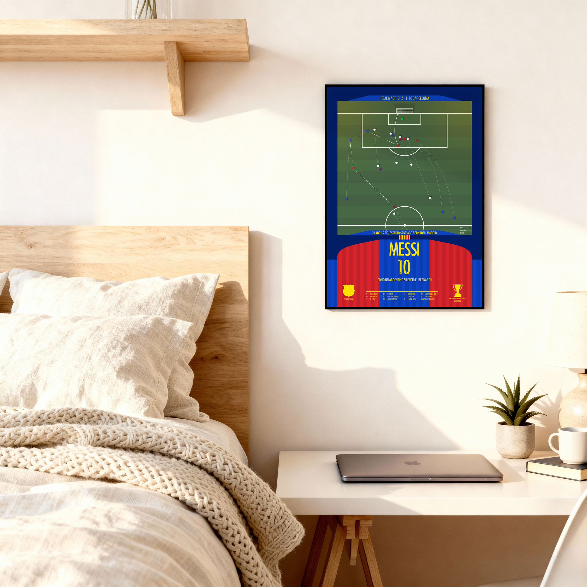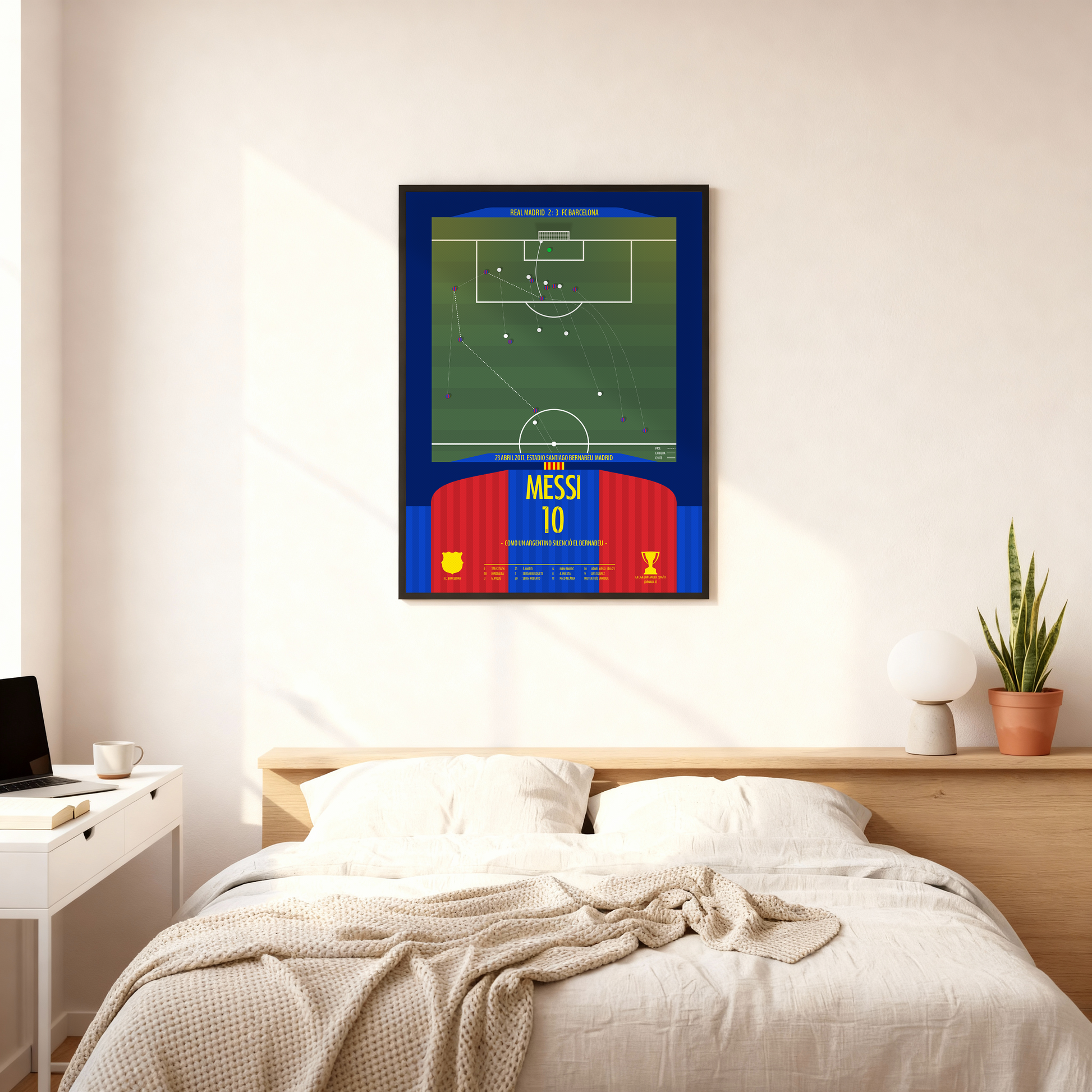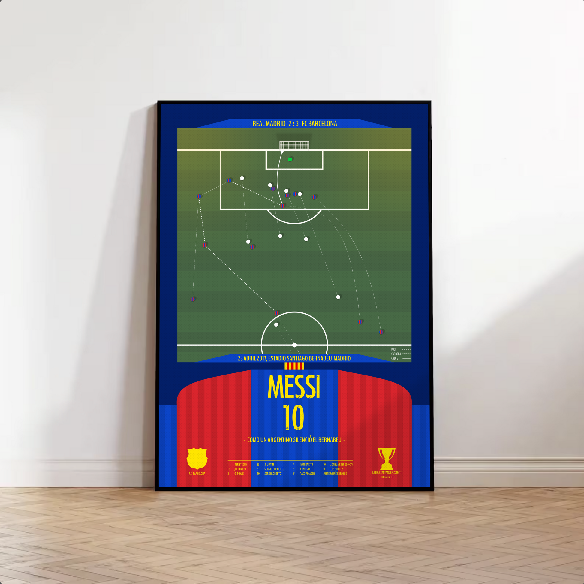 Revive la emoción de una noche inolvidable con este póster que inmortaliza el gol de Lionel Messi en el minuto 93 del Clásico en el Santiago Bernabéu. Una jugada coral, una definición magistral y una celebración icónica: la camiseta alzada frente al público rival. Este diseño captura la esencia del genio argentino, su frialdad en los momentos decisivos y su eterna huella en la historia del fútbol. Ideal para coleccionistas y aficionados culés, este póster rinde homenaje a la grandeza de Messi y a una de las victorias más recordadas del FC Barcelona.