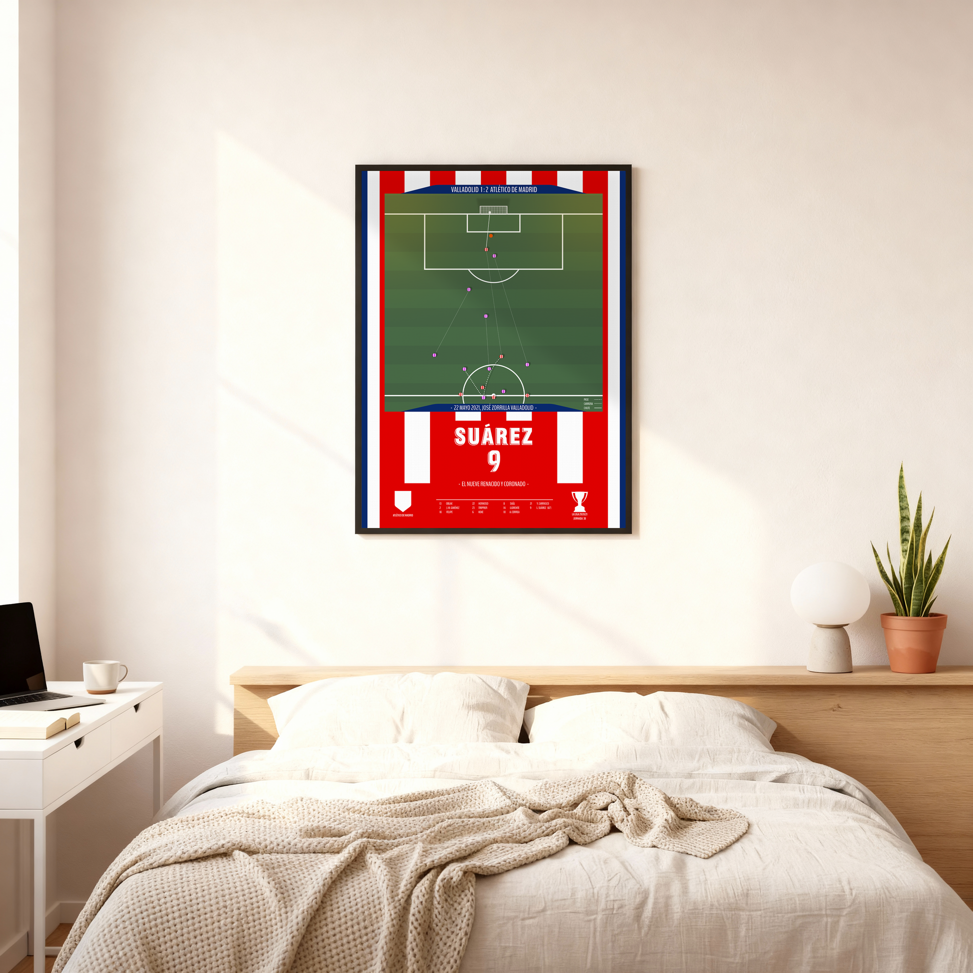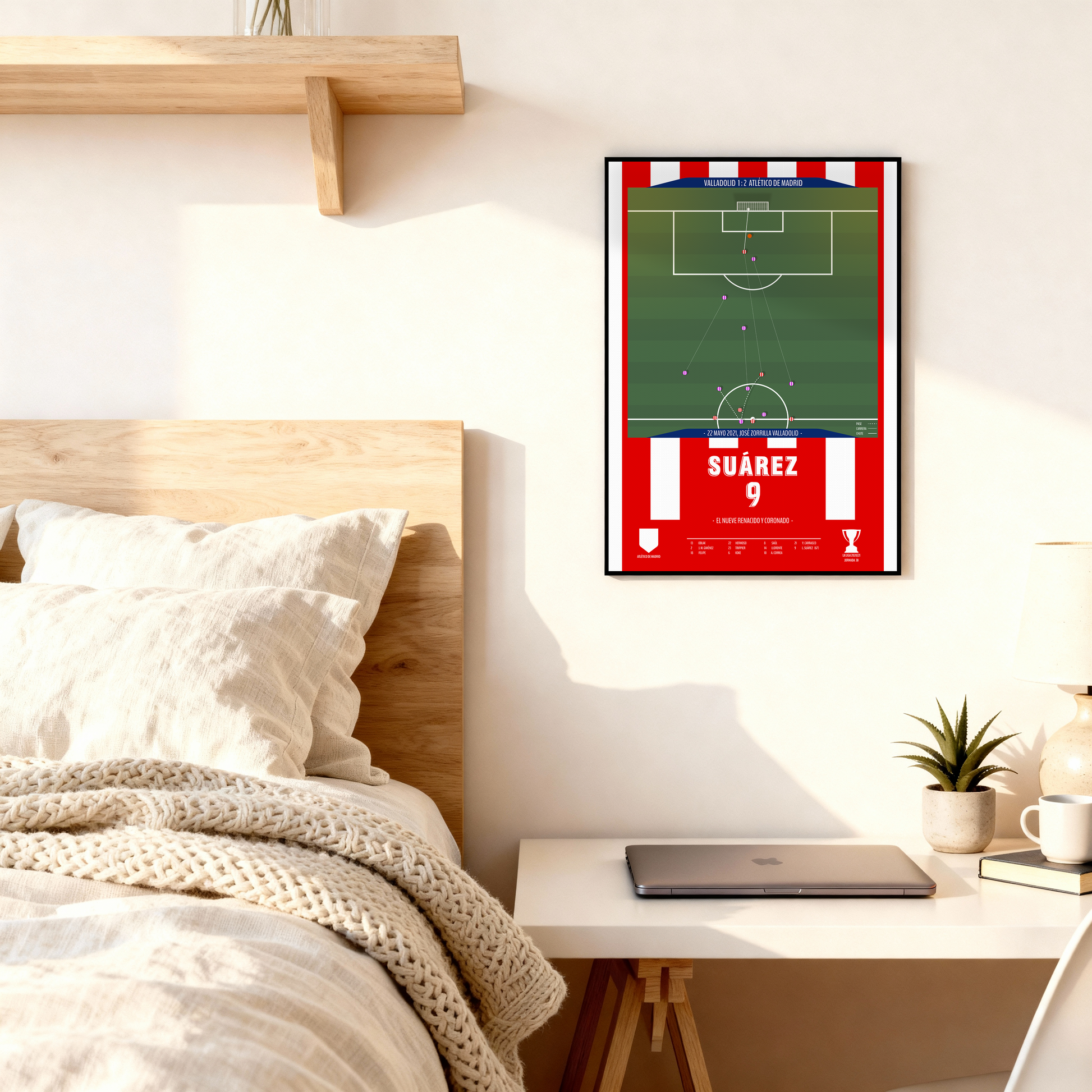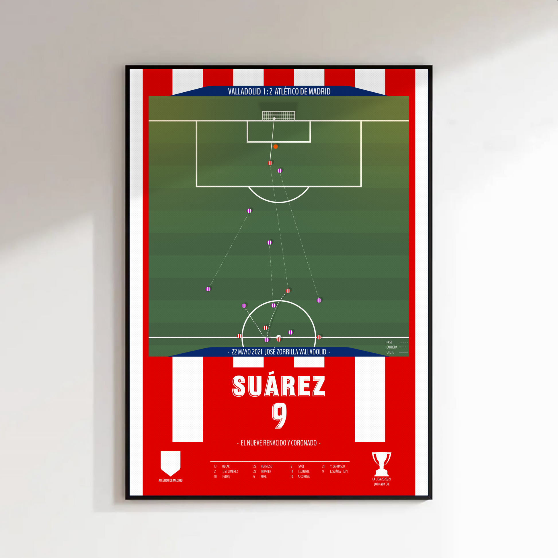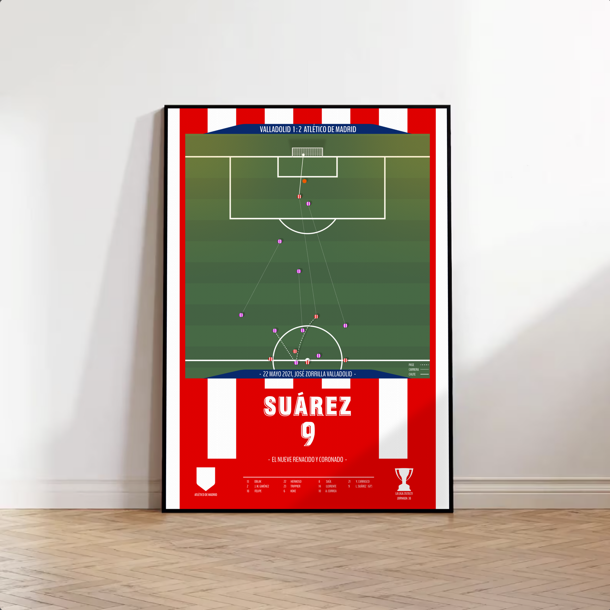 Revive la emoción del momento que hizo historia con este póster que inmortaliza el gol de Luis Suárez frente al Valladolid en la última jornada de LaLiga 2020/21. Una definición letal, un grito de campeón y el tanto que devolvió al Atlético de Madrid la gloria del título tras siete años de espera. Este diseño captura la garra, la determinación y la pasión de un delantero que nunca se rinde. Ideal para coleccionistas y aficionados rojiblancos, este póster rinde homenaje a la entrega, al esfuerzo y al espíritu que define al Atlético.
