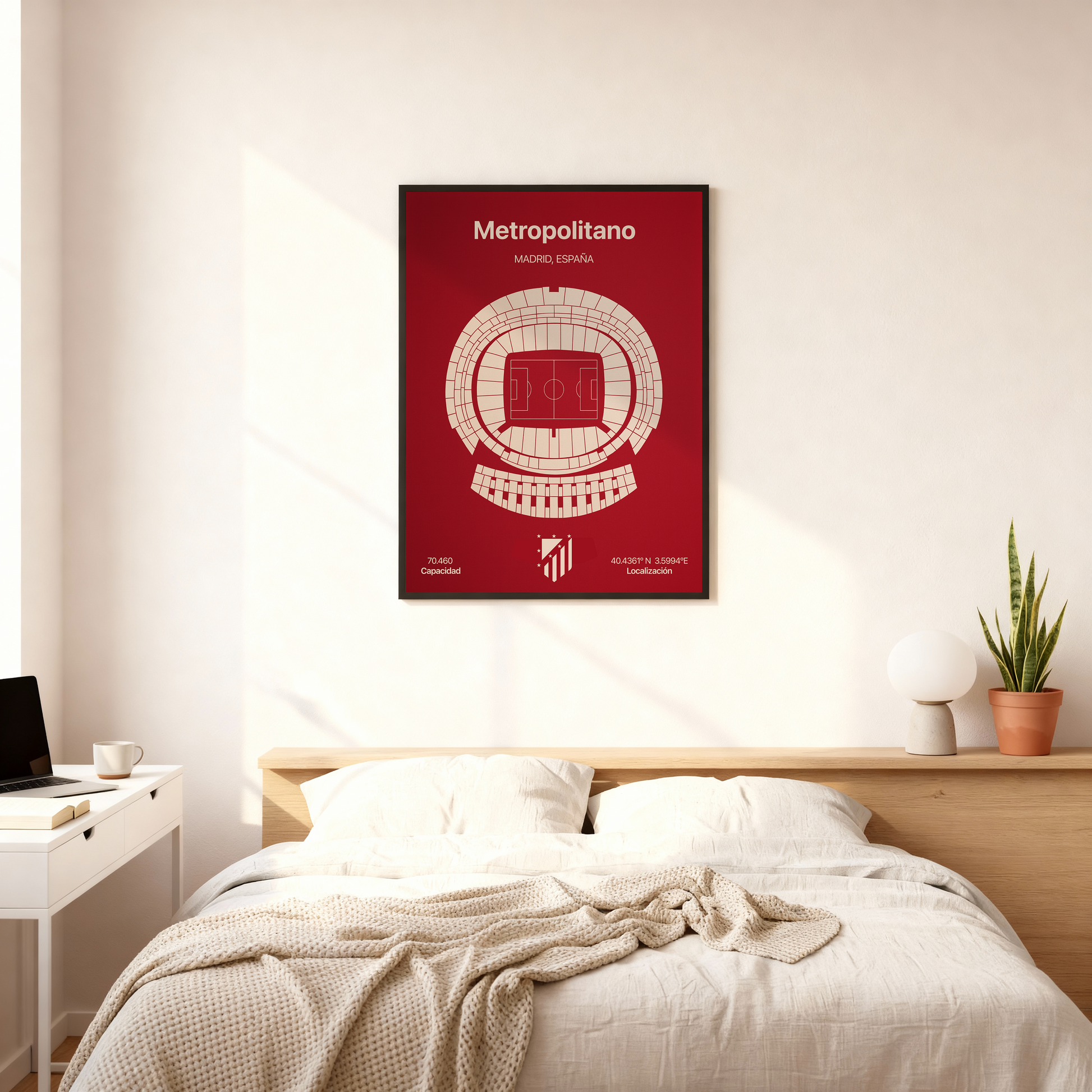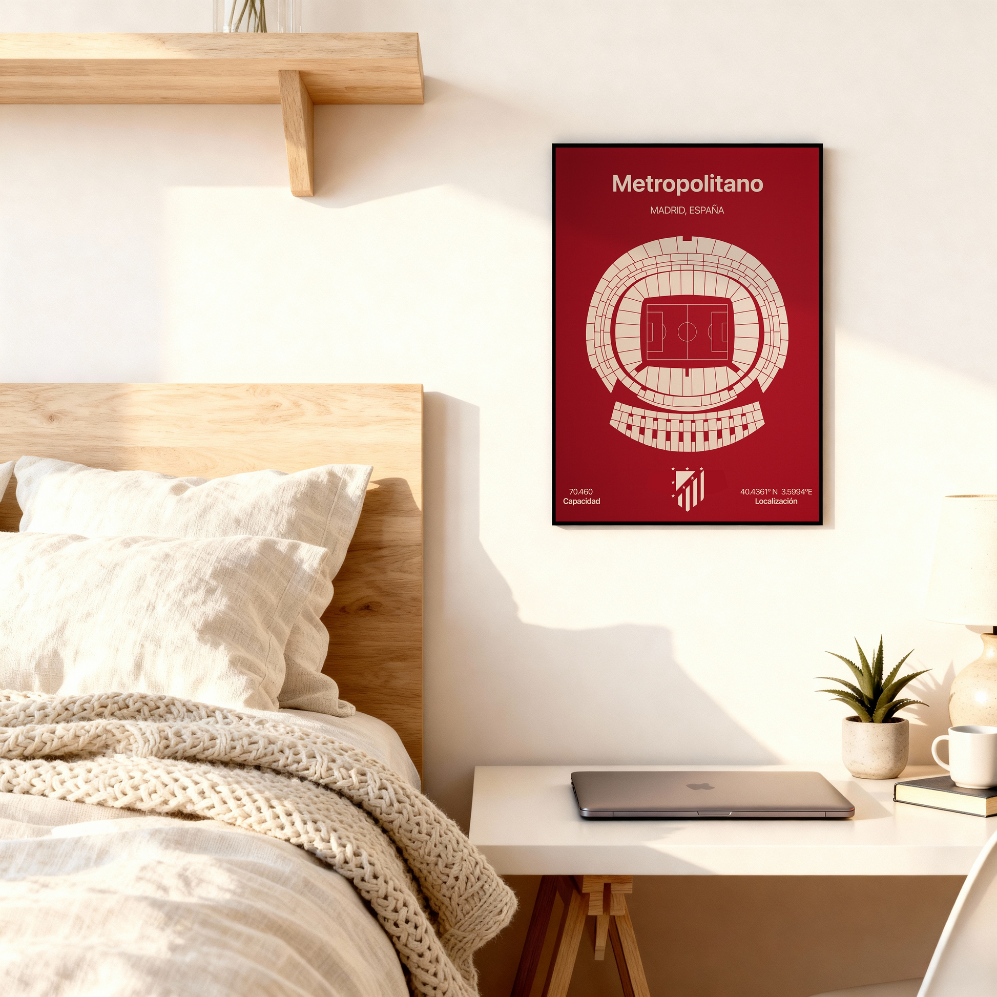 Más que arquitectura, este póster simboliza la unión inquebrantable entre el equipo y su gente. Es un homenaje a la pasión desmedida, al sentimiento que se transmite de padres a hijos y a la nueva casa donde el Atlético de Madrid sigue luchando como hermanos. Perfecta para todo colchonero que lleva las rayas rojas y blancas en el alma.