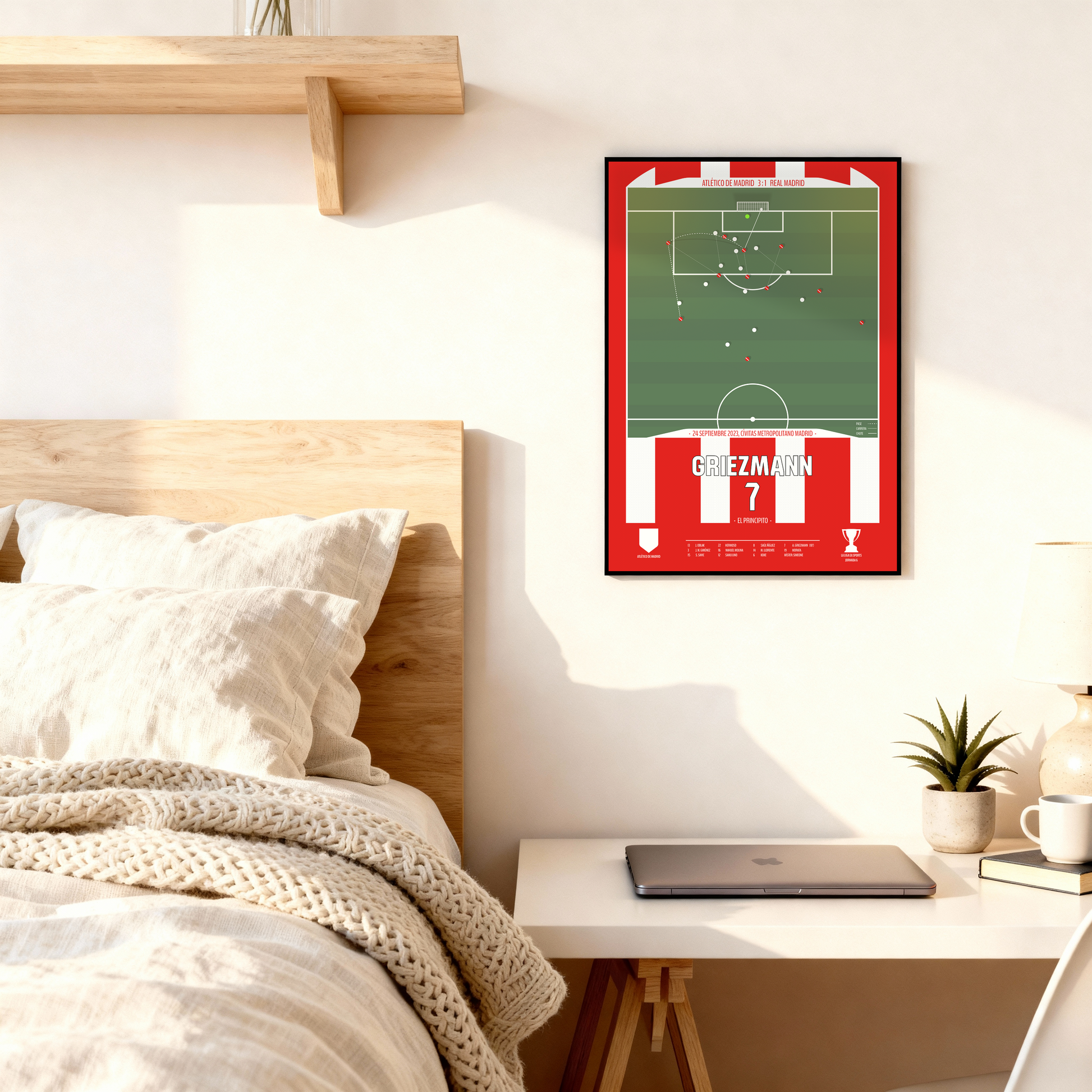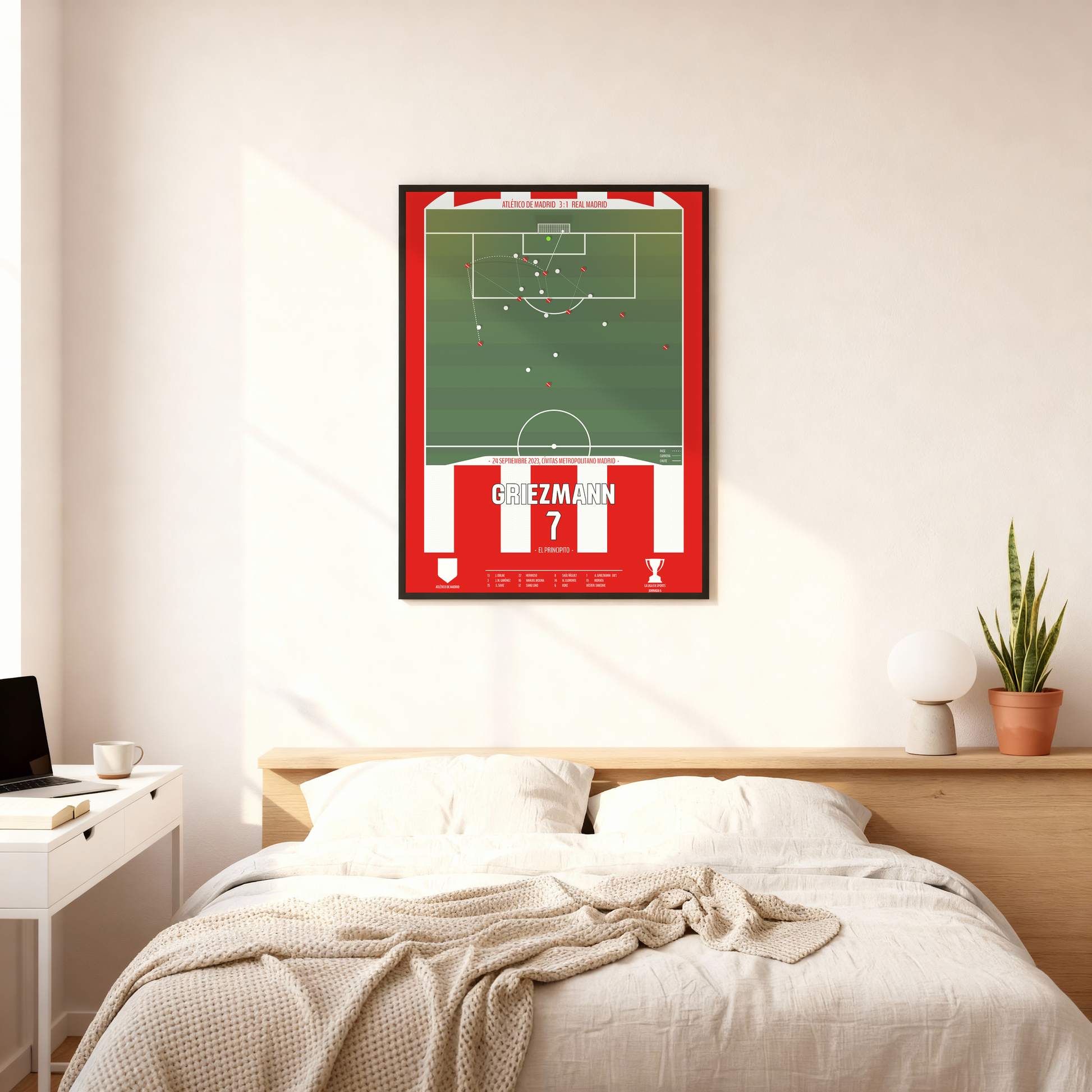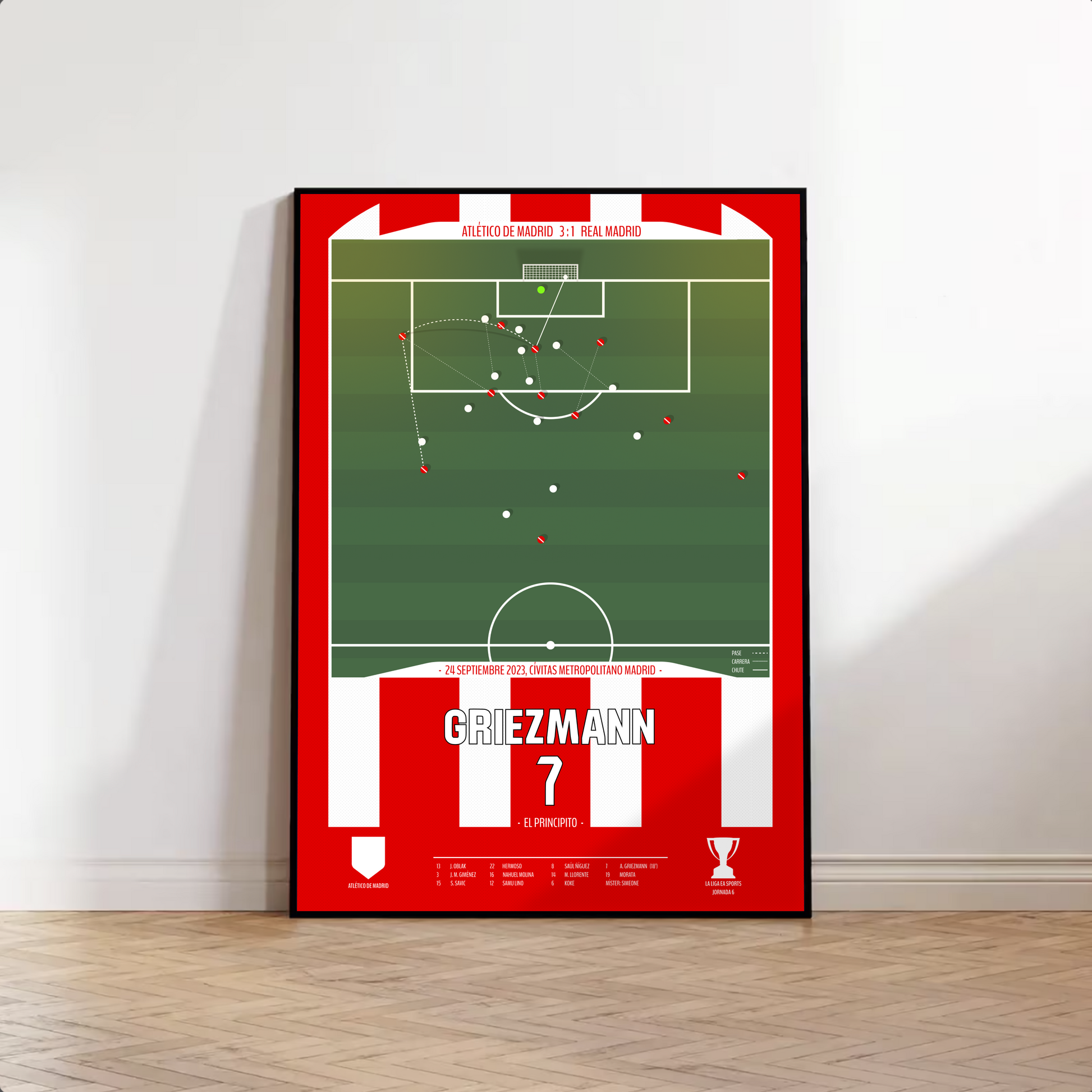 Celebra la magia rojiblanca con este póster del gol de Antoine Griezmann en la victoria del Atlético de Madrid frente al Real Madrid en el derbi de septiembre de 2023. Una jugada coral culminada por el francés que encendió el Cívitas Metropolitano y simbolizó el carácter y la pasión del equipo del Cholo. Esta lámina captura el momento en que Griezmann volvió a brillar con el número 7 en la espalda, uniendo elegancia, compromiso y gol. Perfecta para cualquier aficionado colchonero o amante de los grandes partidos de LaLiga.