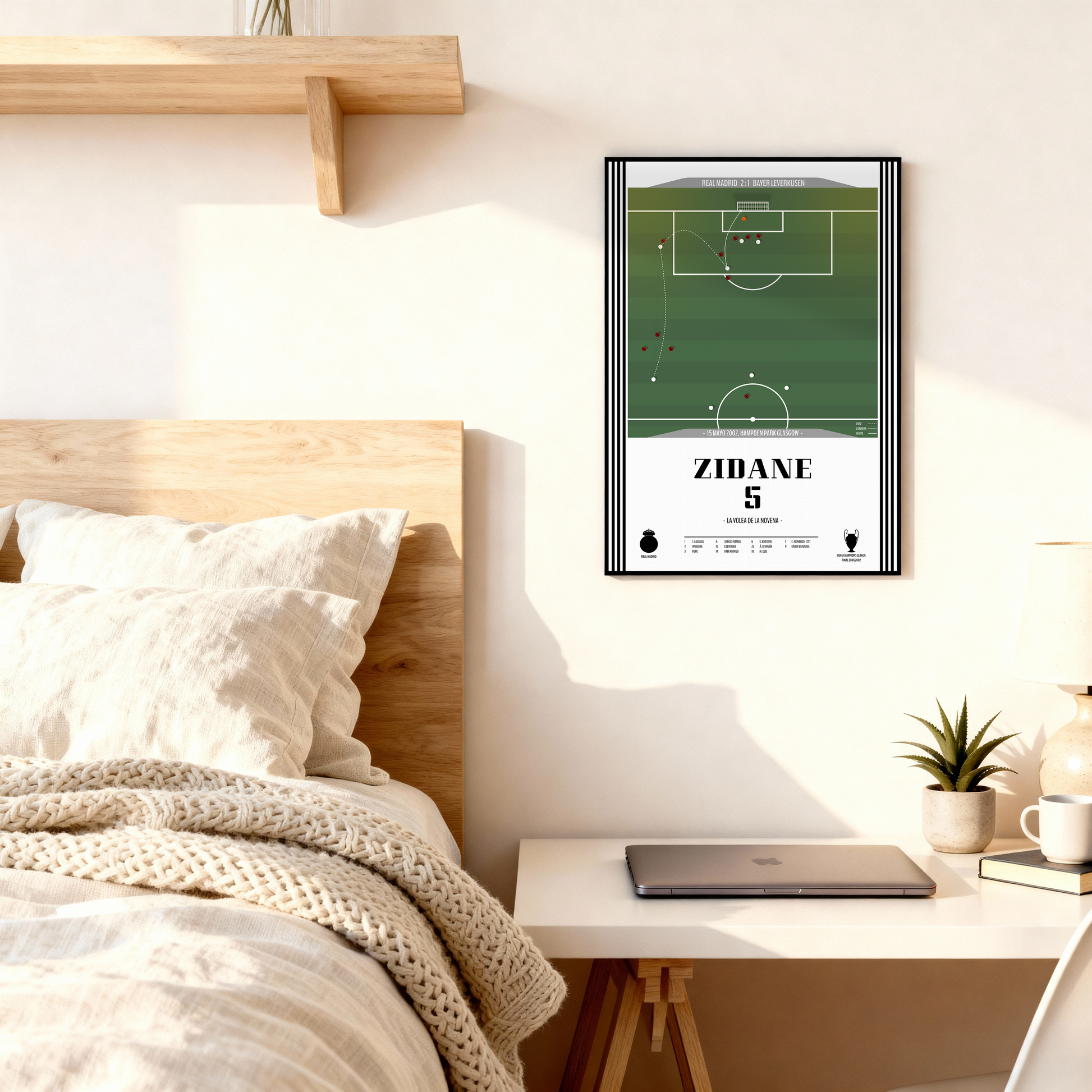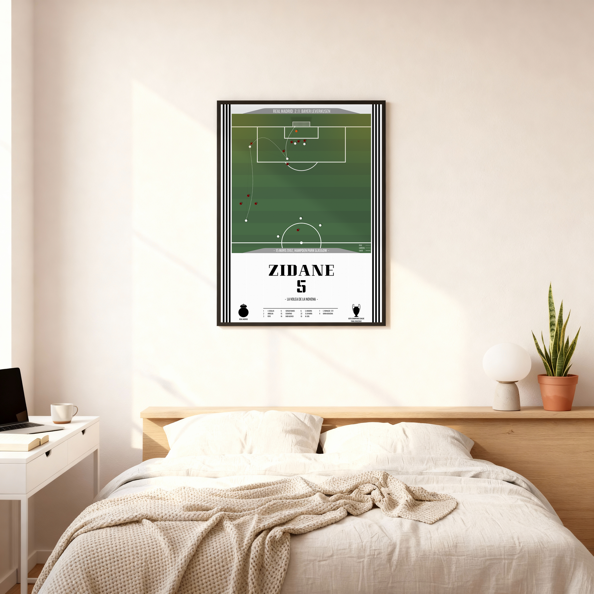 Revive la magia de una noche legendaria con este póster que inmortaliza la volea de Zinedine Zidane en la final de la Champions League 2002. Un gesto técnico perfecto, un instante eterno y el gol que dio al Real Madrid su ansiada Novena Copa de Europa. Este diseño captura la elegancia y la precisión de una obra maestra que definió una era. Ideal para coleccionistas y aficionados madridistas, este póster rinde homenaje a la belleza del fútbol y al genio que lo hizo posible.
