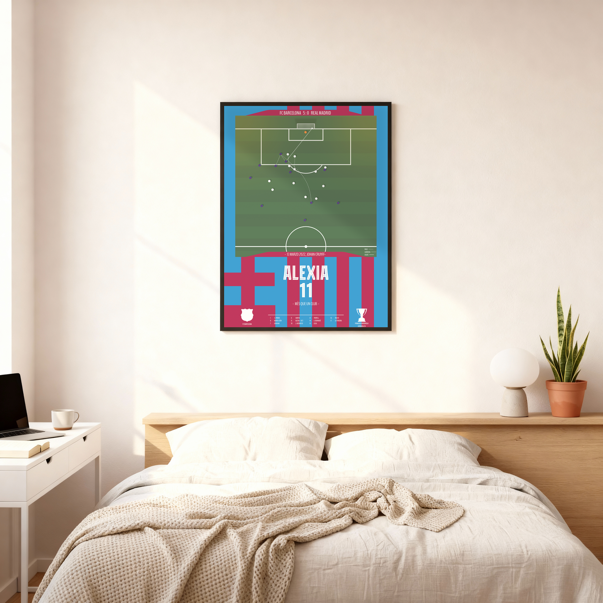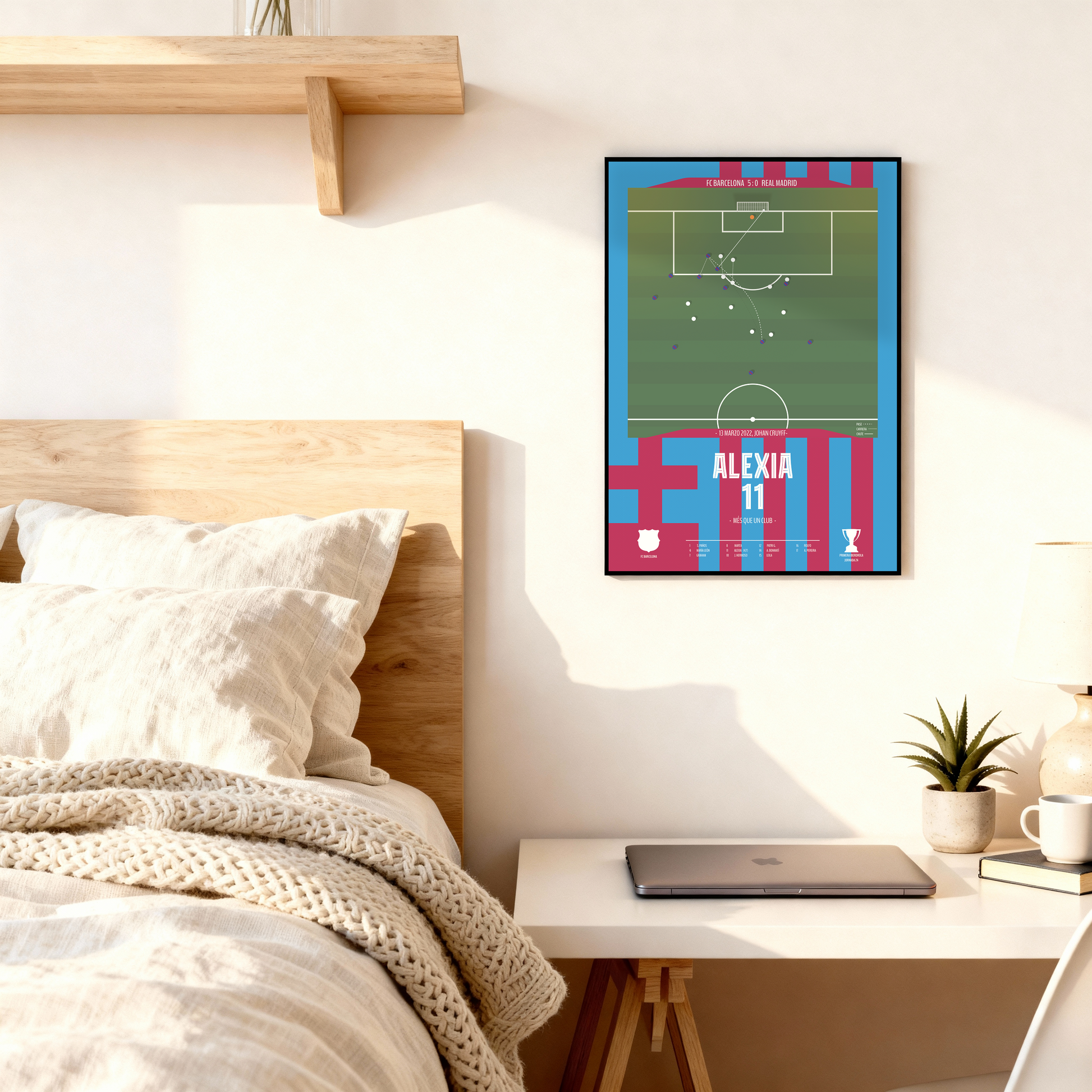 Celebra el talento y la elegancia de Alexia Putellas con este póster que inmortaliza su gol en la victoria por 5-0 ante el Real Madrid en el Johan Cruyff. Una definición impecable que resume el estilo del Barça femenino: toque, precisión y espectáculo. Este diseño rinde homenaje a la capitana blaugrana y a un equipo que ha marcado una era en el fútbol europeo. Perfecto para coleccionistas y aficionados culés, este póster captura la esencia del “Més Que Un Club” en su máxima expresión.